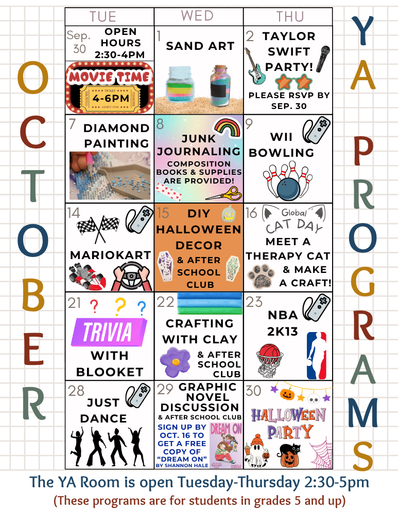 The Youth Room is open Tuesdays, Wednesdays, and Thursdays from 2:30-5pm